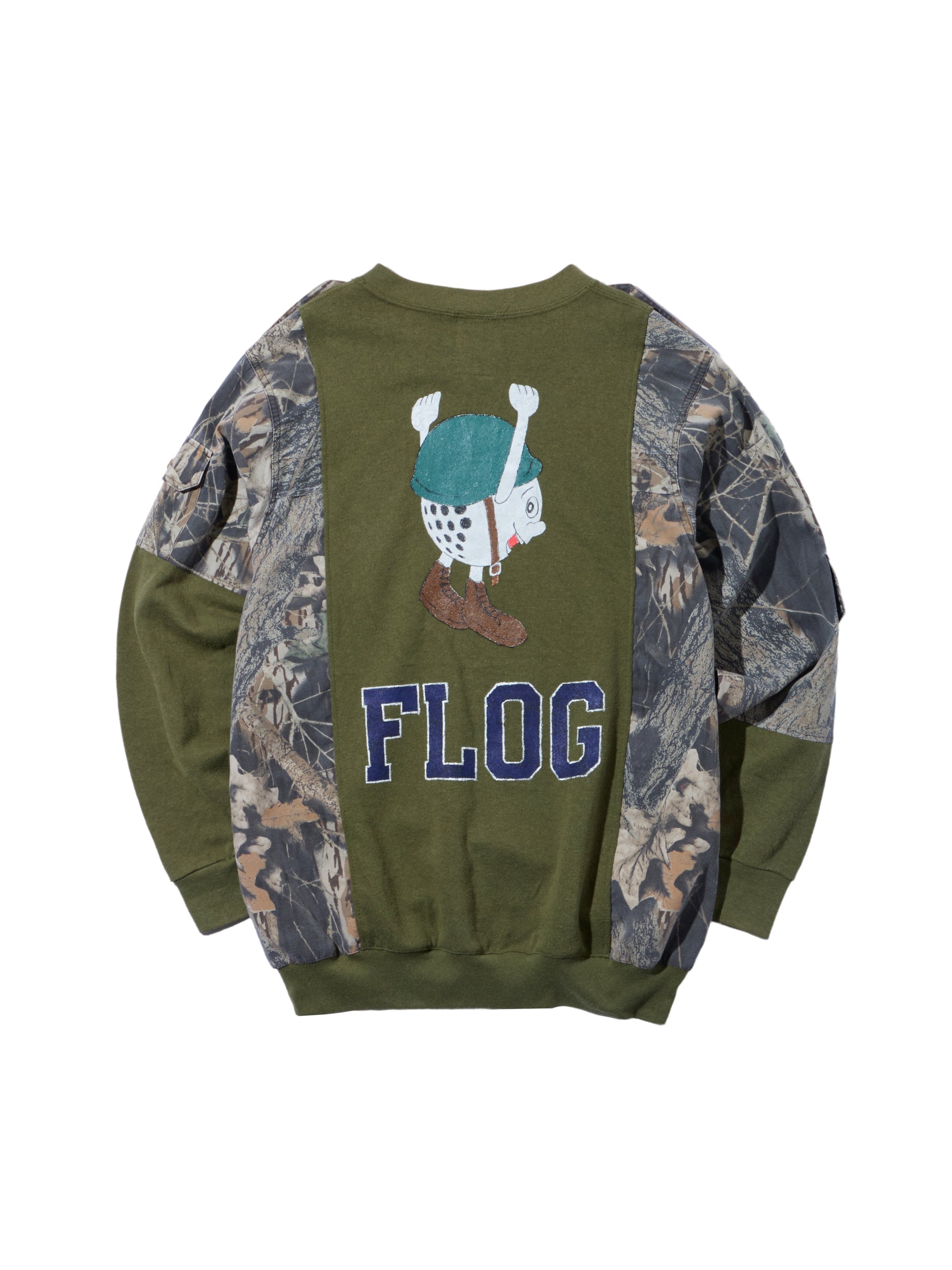 米軍トレーニングスウェットをベースに、リアルツリー柄のシャツを合わせている。