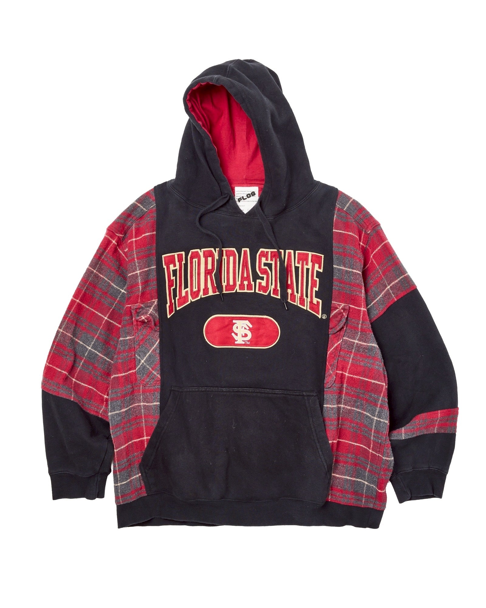 カレッジスウェットパーカーにレッド系のネルシャツを掛け合わせた一枚。